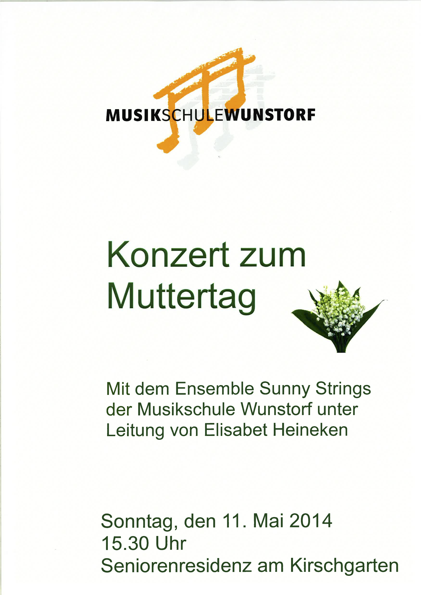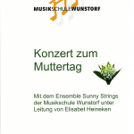 Am Sonntag den 11. Mai ist das Ensemble Sunny Strings der Musikschule Wunstorf unter Leitung von Frau Elisabet Heineken bei uns zu Gast. Ab 15.30 Uhr geben die Schülerinnen und Schüler ein Konzert zum Muttertag.